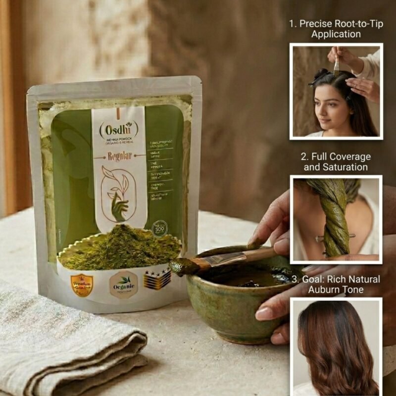 Osdhi Organic Regular Mehndi Powder is a herbal and chemical-free option specially suitable for hair use. It is designed for regular hair care and can be used by customers looking for a fine powder, triple-sifted, and easy-to-mix mehndi powder. Since it is made for hair application, it should be clearly presented as a hair care product rather than a bridal mehndi product.